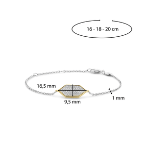 This TI SENTO silver bracelet 23028ZY flaunts a pavé of dazzling white cubic zirconia stones handset in a yellow gold-plated setting. The bracelet is crafted from the highest quality 925 sterling silver and then coated with a platinum layer to protect it from daily wear and keep it luminous. Its modern classic geometric shape makes for a charming and stylish piece. With its sparkling pavé of cubic zirconia stones, this bracelet is sure to catch the eye and become a conversation starter. Whether worn as a statement piece or layered with other bracelets for a trendy stacked look, it will effortlessly elevate your style. It features a delicate silver chain and a secure clasp, allowing for a customised and adjustable fit. All our bracelets are nickel-free and hypoallergenic.
