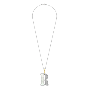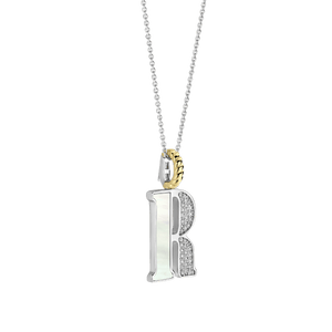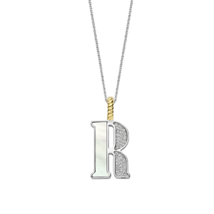 Embrace timeless elegance with this TI SENTO gold-plated silver Letter R Pendant 6840MW_R. This elegant pendant showcases a luminous mother-of-pearl "R" handset with a sparkling pavé of white cubic z... read more