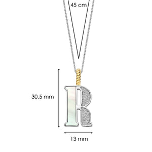 Embrace timeless elegance with this TI SENTO gold-plated silver Letter R Pendant 6840MW_R. This elegant pendant showcases a luminous mother-of-pearl "R" handset with a sparkling pavé of white cubic zirconia. Crafted from lustrous 925 sterling silver, it is then coated with precious platinum to protect it and keep it luminous. Its clip ring is plated with radiant yellow gold, exuding a sense of refined sophistication. The mother-of-pearl shimmers with an ethereal glow, reminiscent of moonlight dancing on a calm ocean. The letter R symbolises radiance and refinement, representing a captivating presence and timeless elegance. This pendant is more than just jewellery; it's a statement piece for the modern muse. Wear it solo for a striking, minimalist statement or layer it with other letters or pendants for a personalised, trendsetting look. The pendant comes with a delicate 45cm silver chain that adds a touch of elegance. Crafted with care for sensitive skin, this nickel-free and hypoallergenic pendant ensures lasting comfort and quality.